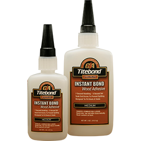 Titebond Instant Bond is a two-part bonding system that takes between 5 - 15 seconds to set and 30 - 60 seconds for initial cure. It provides a strong, permanent bond and is ideal for hard to reach joints or surface areas that are difficult to clamp. Designed primarily for wood and wood products, this adhesive is also very effective on a wide variety of materials and substrates. Titebond Instant Bond Medium viscosity product offers an assembly time of 7 seconds and an initial cure speed of 5 seconds. In addition to typical bonding applications, it is ideal for filling knots and voids in wood, adhering pen tubes to blanks for pen turning applications, and for soaking end-grain to prevent splitting.
